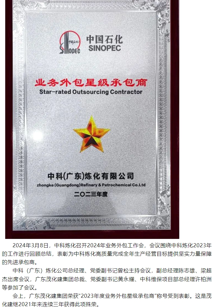 喜報:榮獲中(zhōng)科煉化“2023年度(dù)業務外包星(xīng)級承包商”稱(cheng)号🔴
