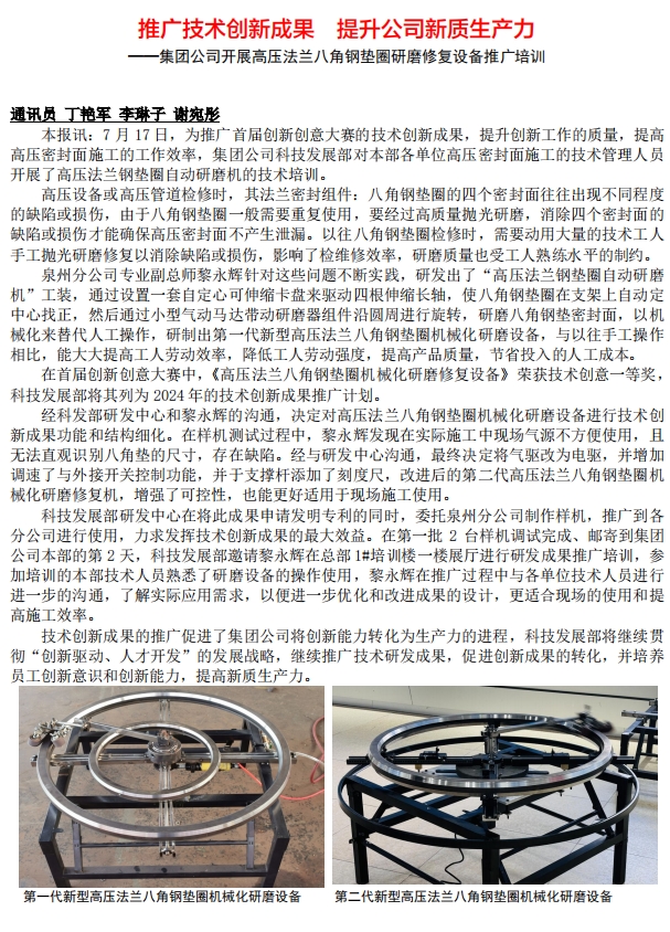 推廣(guǎng)技術創(chuàng)新成果(guǒ) 提升公(gōng)司新質(zhi)生産力(li) ——集團公(gong)司開展(zhǎn)高壓法(fa)蘭八角(jiǎo)鋼墊圈(quān)研磨修(xiū)